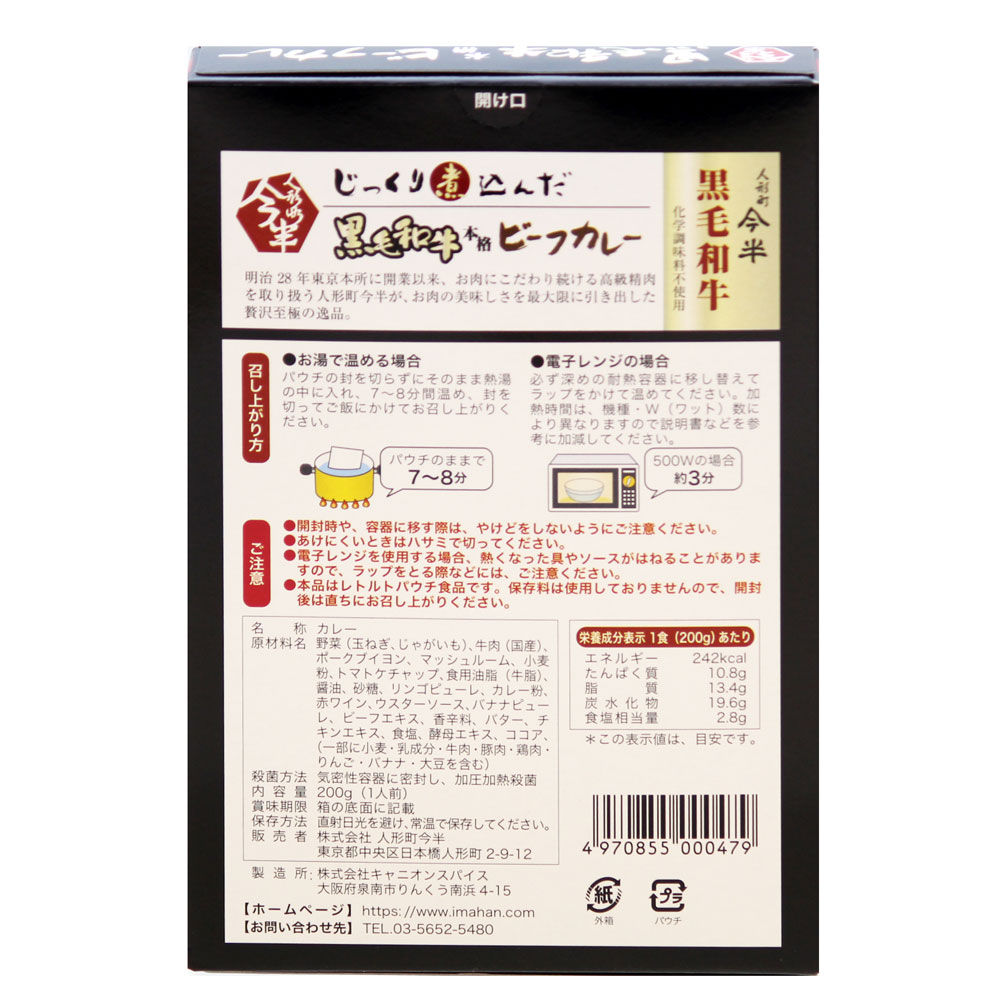 明治28年東京本所に開業以来、お肉にこだわり続ける高級精肉を取り扱う人形町今半が、お肉の美味しさを最大限に引き出した贅沢至極の逸品。黒毛和牛のすね肉を、たまねぎ・りんごなどと一緒にじっくり煮込み隠し味に赤ワインを使用した本格的ビーフカレー。