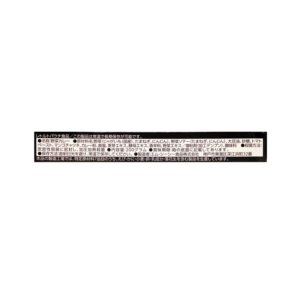 野菜(じゃがいも(国産)、たまねぎ、にんじん)、野菜ソテー(たまねぎ、にんじん)、大豆油、砂糖、トマトペースト、マンゴチャツネ、カレー粉、食塩、麦芽エキス、酵母エキス、香辛料、野菜エキス/増粘剤(加工デンプン)、酸味料