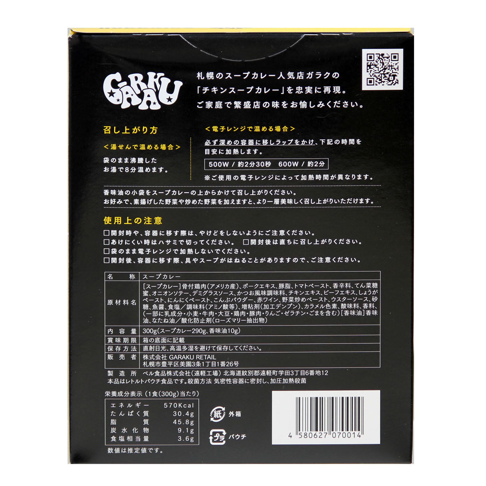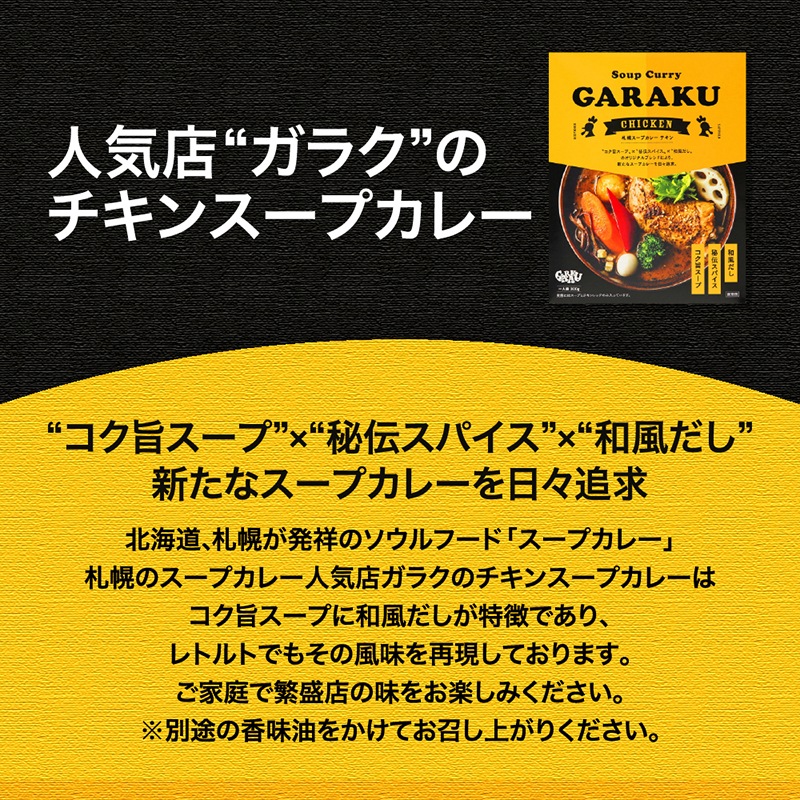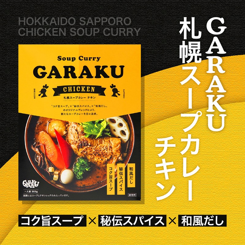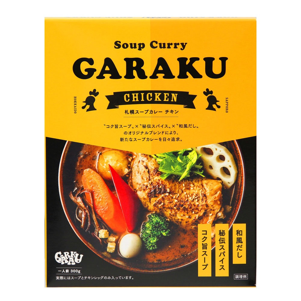 ”コク旨スープ”×”秘伝スパイス”×”和風だし”のオリジナルブレンドにより、新たなスープカレーを日々追求。 札幌のスープカレー人気店ガラクの「チキンスープカレー」を忠実に再現。ご家庭で繁盛店の味をお楽しみください。