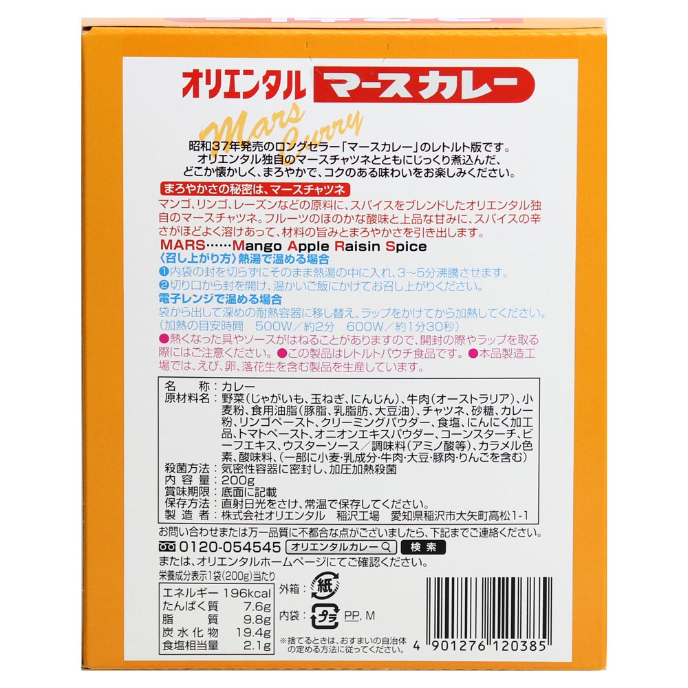 昭和37年発売のロングセラー「マースカレー」のレトルトカレー版です。オリエンタル独自のマースチャツネとともにじっくり煮込んだ、どこか懐かしく、まろやかで、コクのある味わいをお楽しみください。