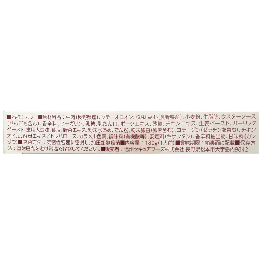 牛肉(長野県産)、ソテーオニオン、ぶなしめじ (長野県産)、小麦粉、牛脂肪、ウスターソース (りんごを含む)、香辛料、マーガリン、乳糖、乳たん白、ポークエキス、砂糖、チキンエキス、生姜ペースト、ガーリック ペースト、食用大豆油、食塩、野菜エキス、粉末水あめ、でん粉、粉末卵白(卵を含む)、コラーゲン(ゼラチンを含む)、チキンオイル、酵母エキス/トレハロース、カラメル色素、調味料 (有機酸等)、安定剤(キサンタン)、香辛料抽出物、甘味料(カンゾウ)