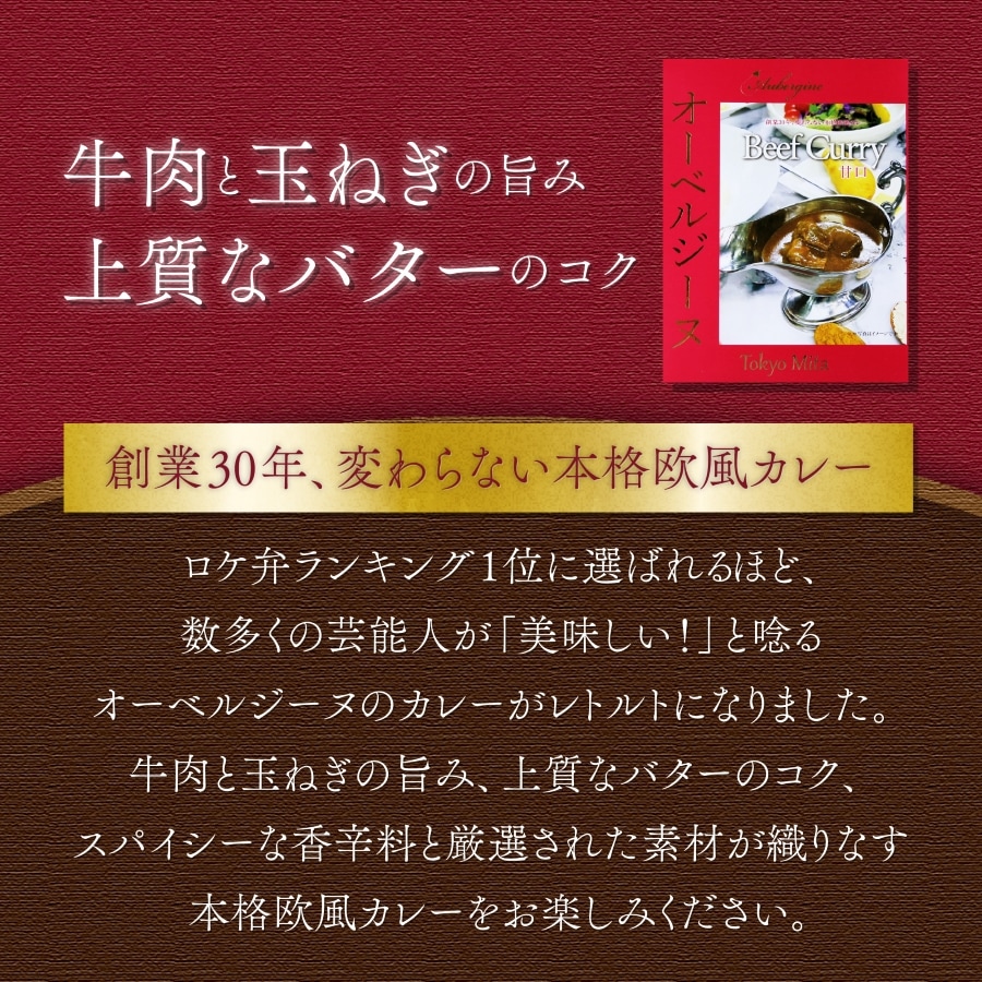 ロケ弁ランキング1位にも選ばれたことがある、TV業界に愛され、数多くの芸能人が「美味しい!」と唸る「オーベルジーヌ」のレトルトカレーが登場しました。玉ねぎの甘味と上質なバターのコク。こみ上げてくるスパイシーな香辛料と厳選された素材が織りなす「オーベルジーヌ」の本格欧風カレーをお楽しみください。