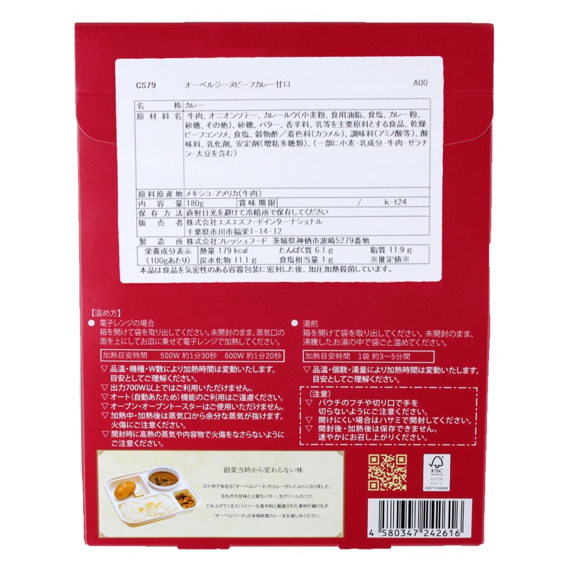 牛肉、オニオンソテー、カレールウ(小麦粉、食用油脂、食塩、カレー粉、砂糖、その他)、砂糖、バター、香辛料、乳等を主要原料とする食品、乾燥ビーフコンソメ、食塩、穀物酢/着色料(カラメル)、調味料(アミノ酸等)、酸味料、乳化剤、安定剤(増粘多糖類)、(一部に小麦・乳成分・牛肉・ゼラチン・大豆を含む)