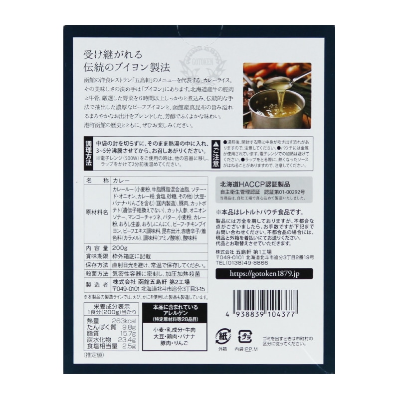 受け継がれる伝統のブイヨン製法。 函館の洋食レストラン「五島軒」のメニューを代表する、カレーライス。その美味しさの決め手は「ブイヨン」にあります。北海道産牛の脛肉と牛骨、厳選した野菜を6時間以上しっかりと煮込み、伝統的な手法で抽出した濃厚なビーフブイヨンと、函館産真昆布の旨み溢れるまろやかなお出汁をブレンドした、芳醇でふくよかな味わいのレトルトカレー。港町函館の歴史とともに、ぜひお楽しみください。