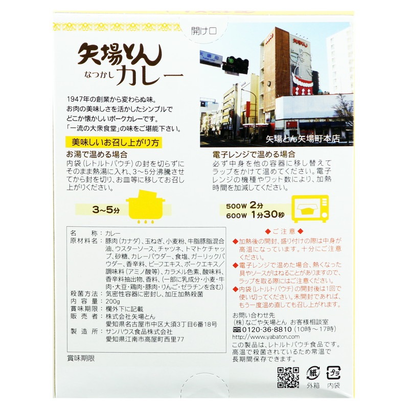 豚肉(カナダ)、玉ねぎ、小麦粉、牛脂豚脂混合油、ウスターソース、チャツネ、トマトケチャッ プ、砂糖、カレーパウダー、食塩、ガーリックパウダー、香辛料、ビーフエキス、ポークエキス/ 調味料(アミノ酸等)、カラメル色素、酸味料、香辛料抽出物、香料、(一部に乳成分・小麦・牛肉・大豆・鶏肉・豚肉・りんご・ゼラチンを含む)