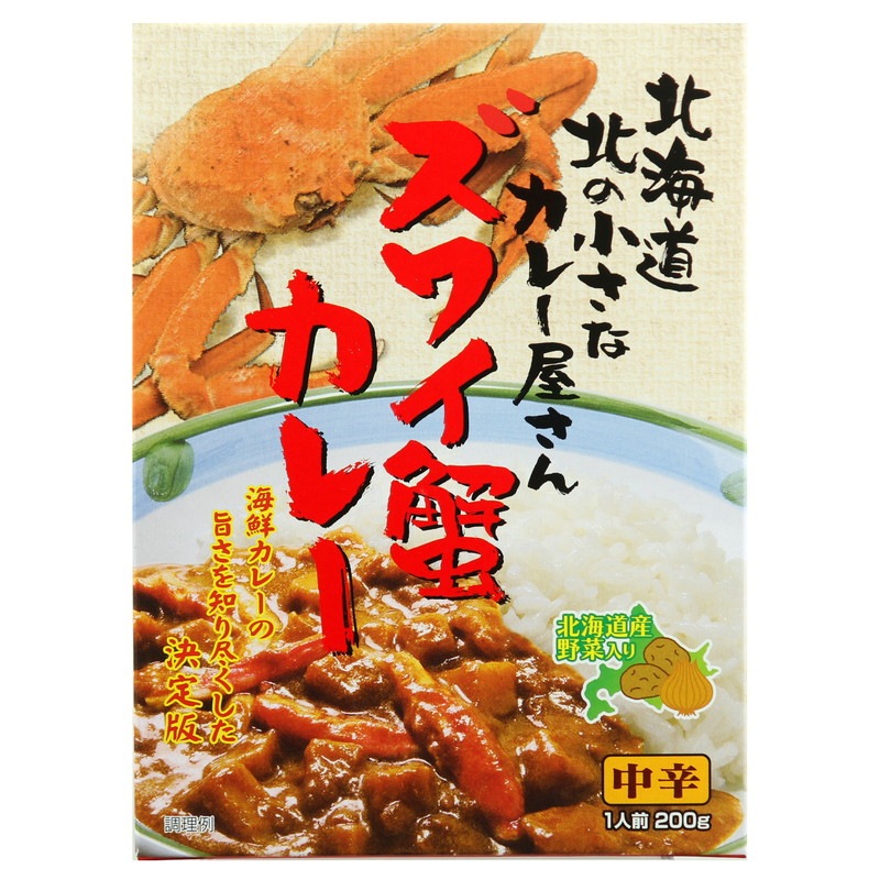 野菜(玉ねぎ(北海道産)、じゃがいも(北海道産)、人参(国産))、カレールウ[小麦粉、牛脂豚 脂混合油脂、ソテー・ド・オニオン、カレー粉、食塩、砂糖、バナナ、乳糖、フォン・ド・ボーソース、 ソースパウダー、香辛料、脱脂粉乳、ぶどう糖、 豚脂、オニオンパウダー、ホエイパウダー、クミン、ガーリックペースト、ジンジャーペースト、チ キンエキス、バターミルクパウダー、調味油、ガーリック・ジンジャーソテー、生クリーム、フライ ドエシャロットペースト、シナモン、カルダモン、 クローブ、ガーリックパウダー、酵母エキス、ナツメグ、ブラックペパー、バター、ローリエ]、ず わいがに、リンゴジャム、シチュールウ、カレー ペースト/カラメル色素、パプリカ色素、調味料(アミノ酸等)、酸味料、加工デンプン、乳化剤、増粘剤(グァーガム)、酸化防止剤(V.C)、p H調整剤、乳酸Ca、(一部に小麦・乳成分・かに・ 牛肉・大豆・バナナ・りんご・鶏肉・豚肉を含む)