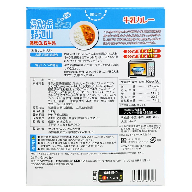 牛乳(長野県製造)、牛肉、じゃがいも、ソテーオニオン、りんごピューレー、本みりん、小麦粉、クリーム(乳製品)、 醸造調味料、砂糖、しょうゆ、ラード、エキス(こんぶ、ビーフ、ポーク)、かつおぶしだし、トマトペースト、バターオイル、カレー粉、ウスターソース、食塩、にんにくペースト、しょうがペースト、香辛料/調味料(アミノ酸等)、増粘剤(加工でん粉)、香料、(一部に乳成分・小麦・牛肉・豚肉・鶏肉・大豆・りんごを含む)