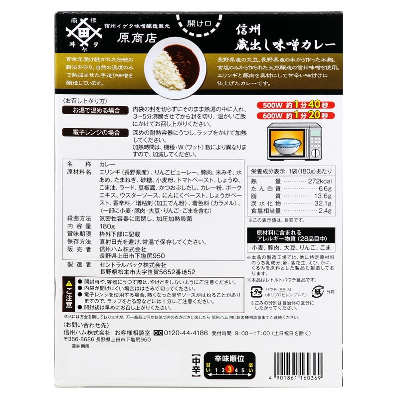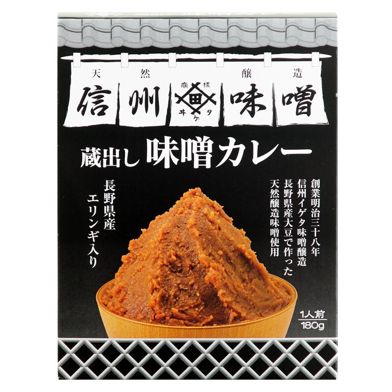 長野県産の大豆、長野県産の米から作った米麹、 食塩のみから作られた天然醸造の信州味噌を使用。 エリンギと豚肉を具材にして甘辛い味付けに 仕上げたカレーです。