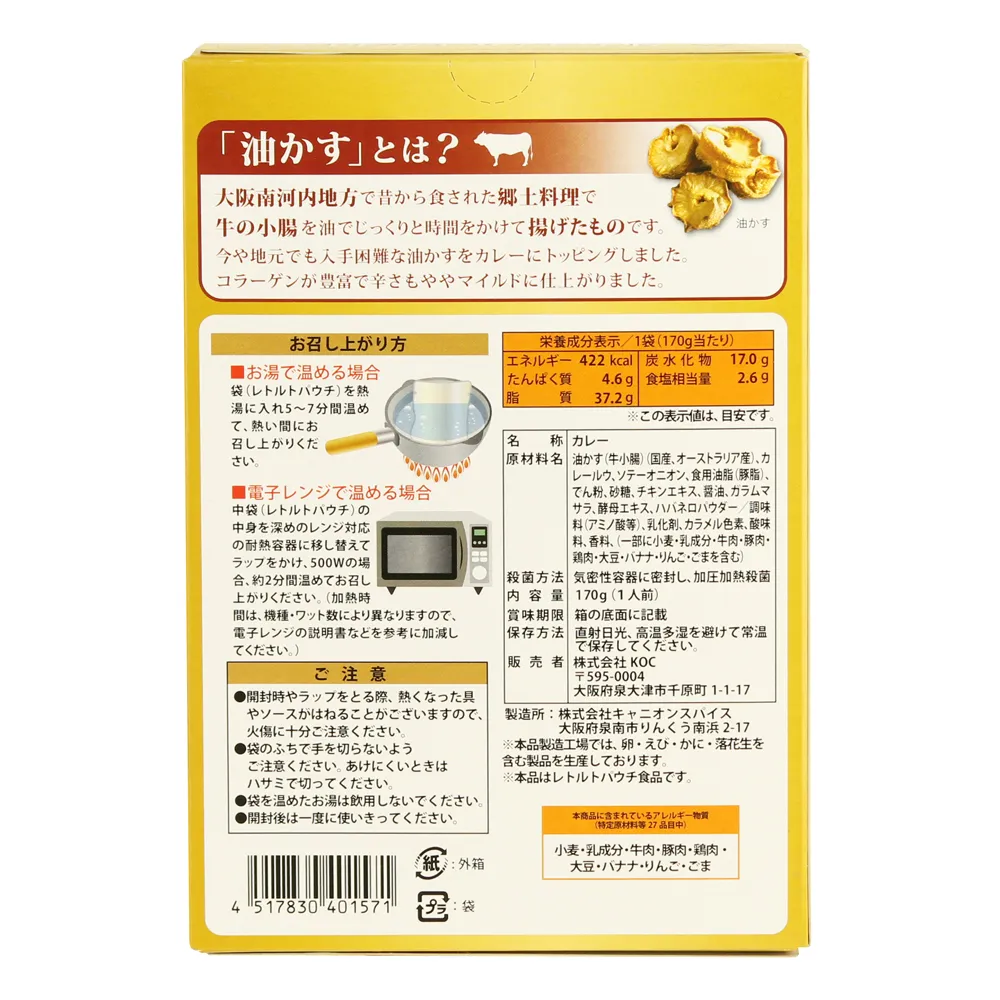 油かす(牛小腸)(国産、オーストラリア産)、カレールウ、ソテーオニオン、食用油脂(豚脂)、でん粉、砂糖、チキンエキス、醤油、ガラムマサラ、酵母エキス、ハバネロパウダー/調味料(アミノ酸等)、乳化剤、カラメル色素、酸味料、香料、(一部に小麦・乳成分・牛肉・豚肉・鶏肉・大豆・バナナ・りんご・ごまを含む)
