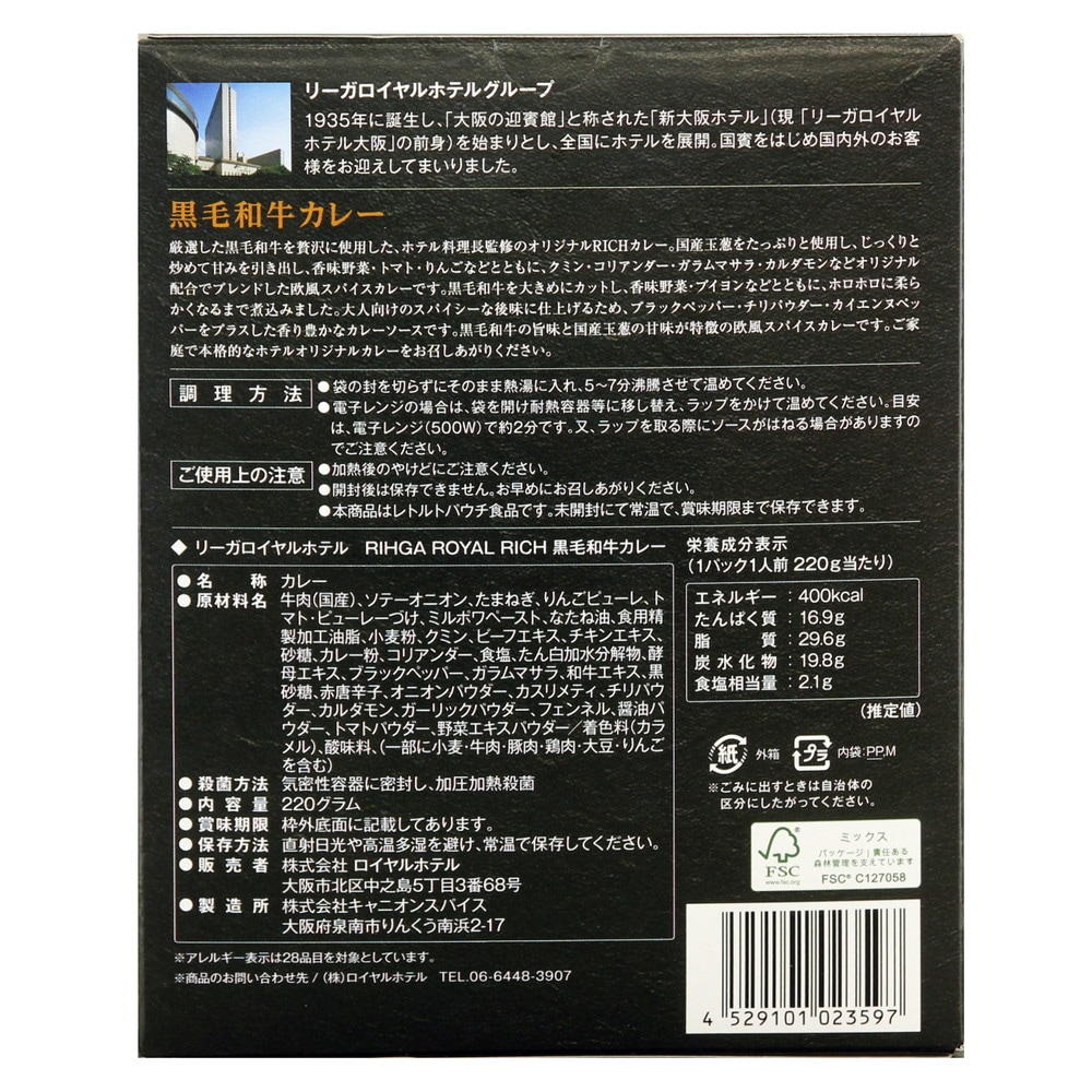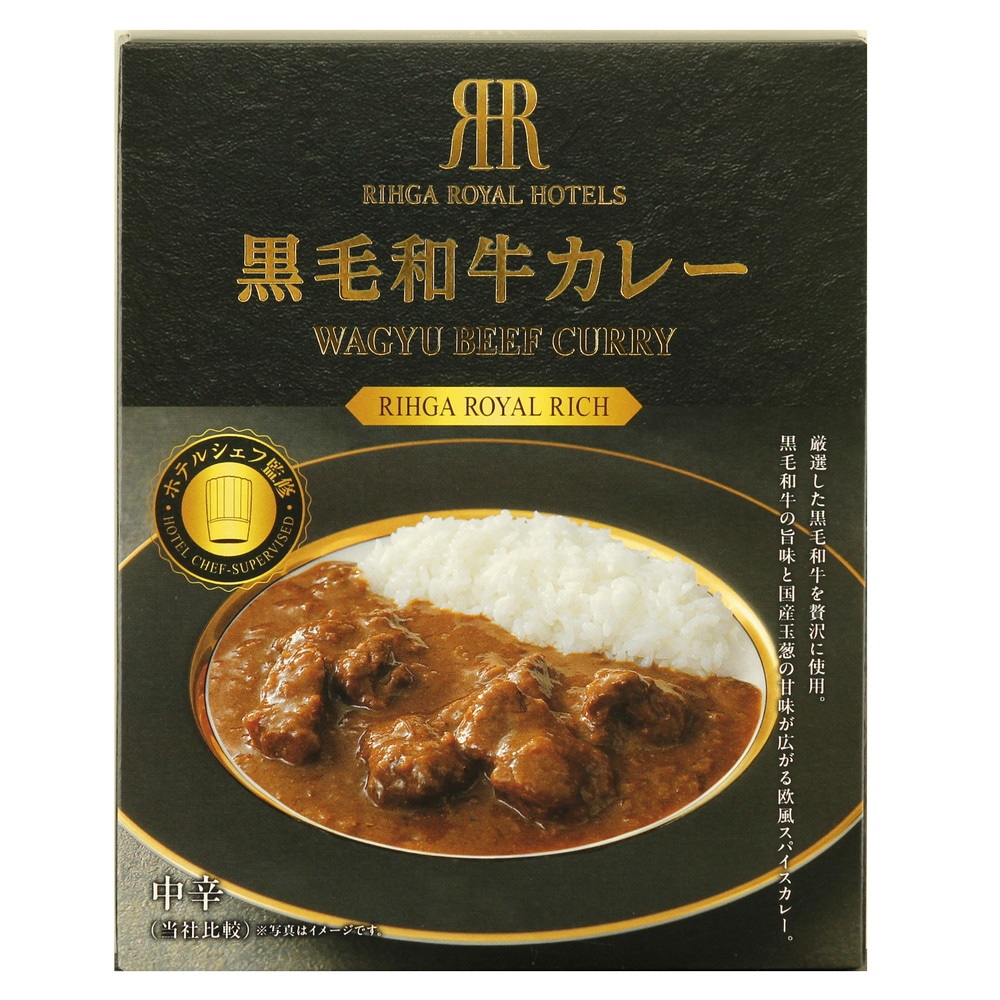 厳選した黒毛和牛を贅沢に使用した、ホテル料理長監修のオリジナルRICHカレー。国産玉葱をたっぷりと使用し、じっくりと炒めて甘みを引き出し、香味野菜・トマト・りんごなどとともに、クミン・コリアンダー・ガラムマサラ・カルダモンなどオリジナル配合でブレンドした欧風スパイスカレーです。黒毛和牛を大きめにカットし、香味野菜・ブイヨンなどとともに、ホロホロに柔らかくなるまで煮込みました。大人向けのスパイシーな後味に仕上げるため、ブラックペッパー・チリパウダー・カイエンヌペッパーをプラスした香り豊かなカレーソースです。黒毛和牛の旨味と国産玉葱の甘味が特徴の欧風スパイスカレーです。ご家庭で本格的なホテルオリジナルカレーをお召しあがりください。