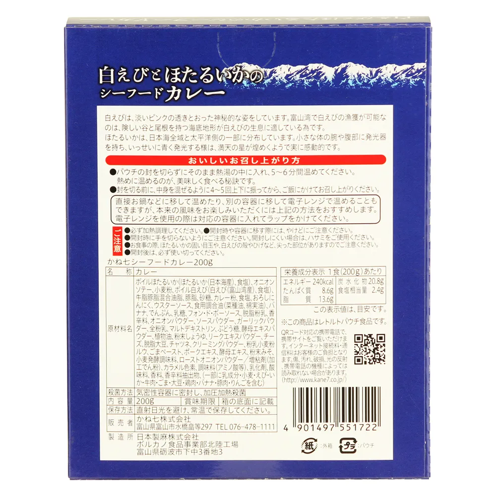 ボイルほたるいか(ほたるいか(日本海産)、食塩)、オニオンソテー、小麦粉、ボイル白えび(白えび(富山湾産)、食塩)、牛脂豚脂混合油脂、豚脂、砂糖、カレー粉、食塩、おろしにんにく、ウスターソース、食用調合油(菜種油、綿実油)、バナナ、でんぷん、乳糖、フォン・ド・ボーソース、脱脂粉乳、香辛料、オニオンパウダー、ソースパウダー、ガーリックパウダー、全粉乳、マルトデキストリン、ぶどう糖、酵母エキスパウダー、植物油、粉末しょうゆ、リークエキスパウダー、チーズ、脱脂大豆、チャツネ、クリーミングパウダー、粉乳小麦粉ルウ、ごまペースト、ポークエキス、酵母エキス、粉末みそ、小麦発酵調味料、ローストオニオンパウダー/増粘剤(加工でん粉)、カラメル色素、調味料(アミノ酸等)、乳化剤、酸味料、香料、香辛料抽出物、(一部に乳成分・小麦・えび・いか・牛肉・ごま・大豆・鶏肉・バナナ・豚肉・りんごを含む)