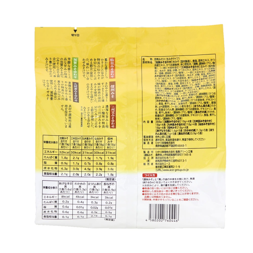 388g(【加賀みそ合わせ】19g×4食【三州豆みそ合わせ】18g×4食【九州麦みそ合わせ】18g×4食【仙台みそ合わせ】18g×4食【信州みそ】18g×4食