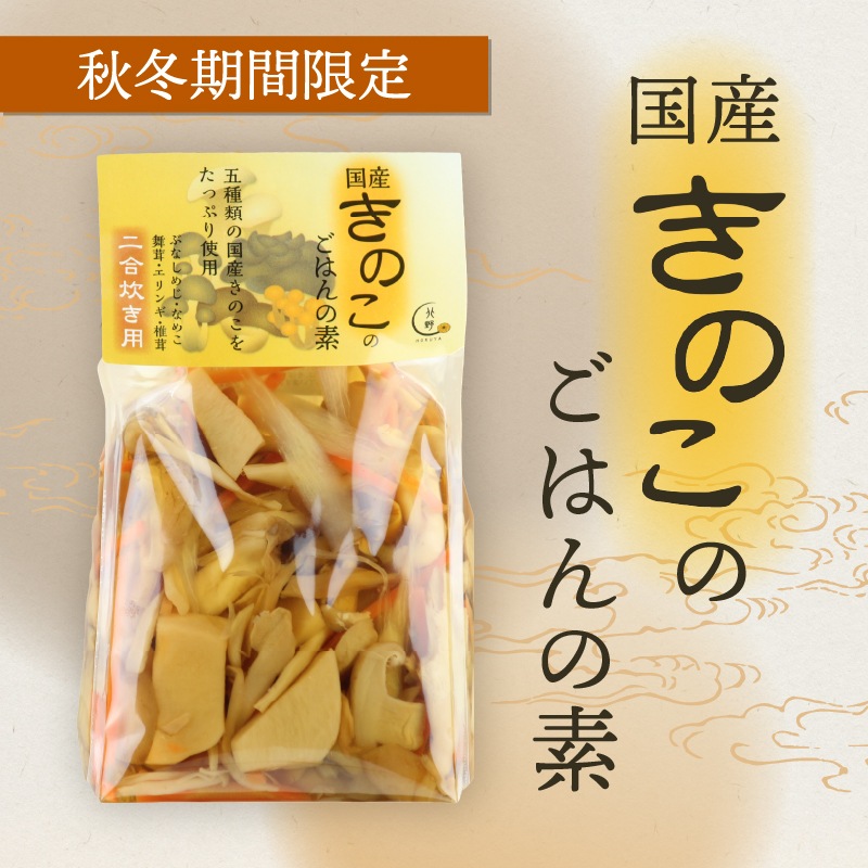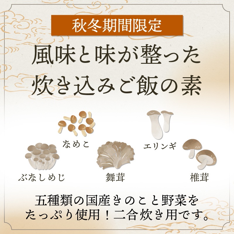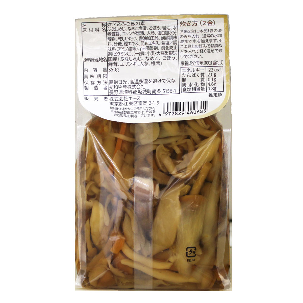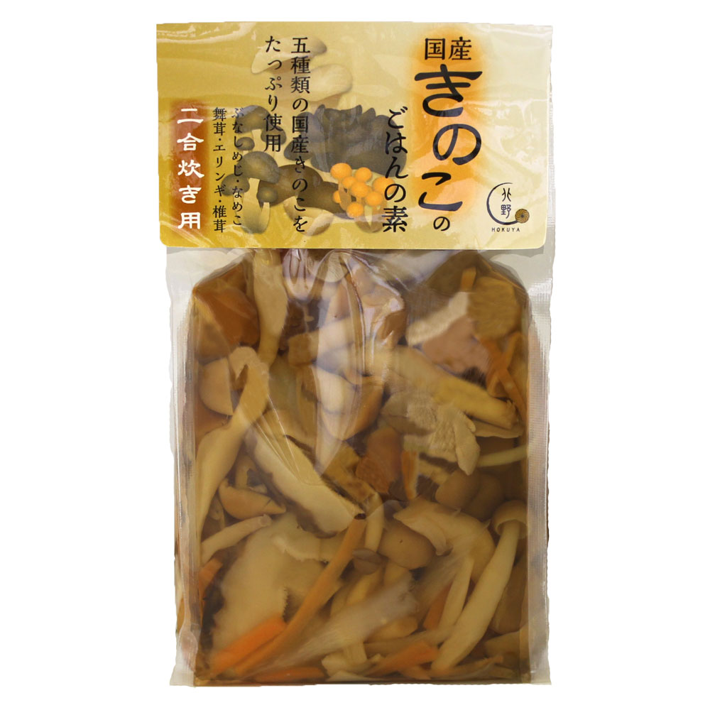 ぶなしめじ、なめこ塩漬、ごぼう、醤油、水煮舞茸、エリンギ塩漬、人参、蛋白加水分解物、乾しいたけ、醤油加工品、発酵調味料、砂糖、鰹エキス、昆布エキス、食塩/調味料(アミノ酸等)、pH調整剤、酸化防止剤(ビタミンC)、(一部に小麦・大豆を含む)