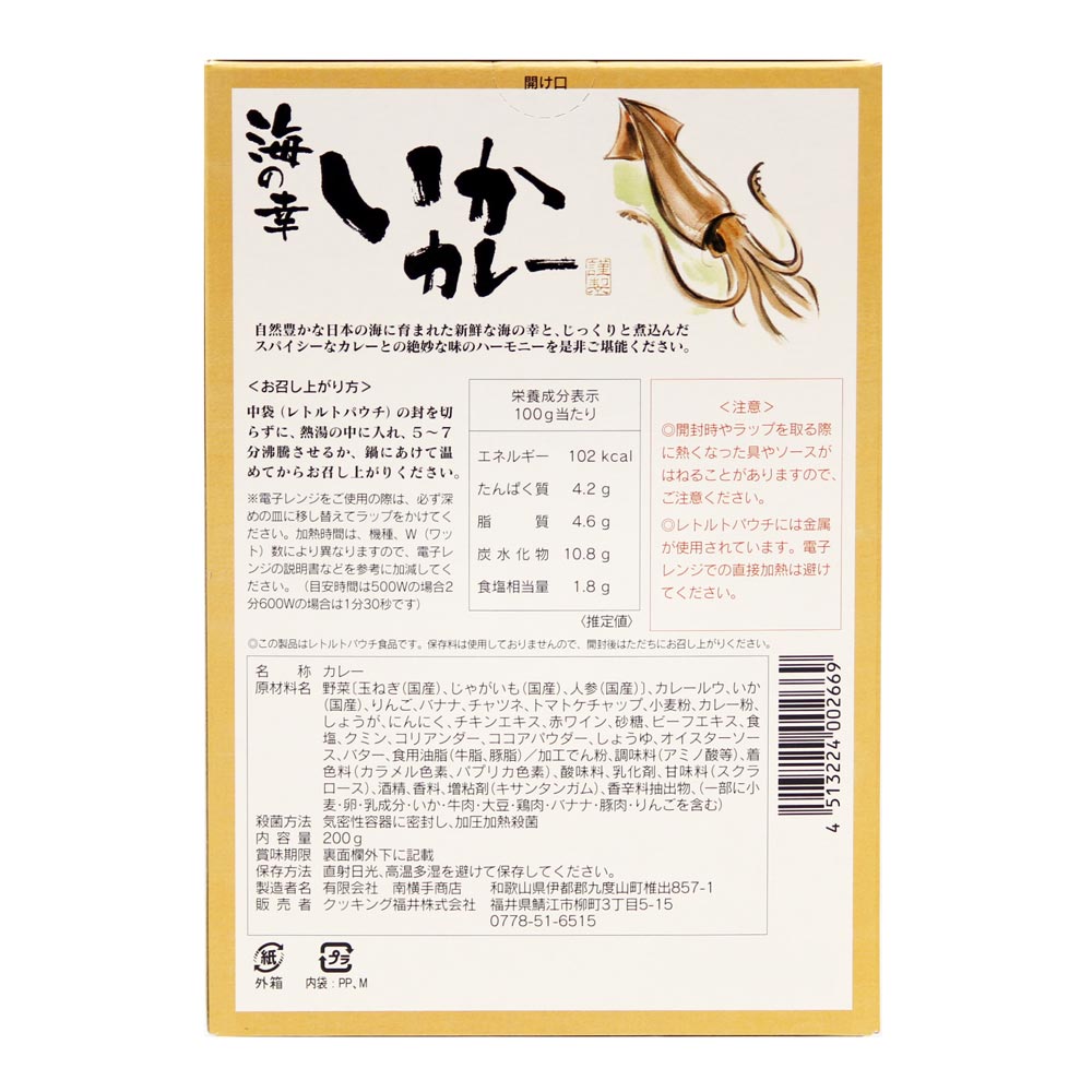 野菜[玉ねぎ(国産)、じゃがいも(国産)、人参(国産)]、カレールウ、いか(国産)、りんご、バナナ、チャツネ、トマトケチャップ、小麦粉、カレー粉、しょうが、にんにく、チキンエキス、赤ワイン、砂糖、ビーフエキス、食塩、クミン、コリアンダー、ココアパウダー、しょうゆ、オイスターソース、バター、食用油脂(牛脂、豚脂)/加工でん粉、調味料(アミノ酸等)、着色料(カラメル色素、パプリカ色素)、酸味料、乳化剤、甘味料(スクラロース)、酒精、香料、増粘剤(キサンタンガム)、香辛料抽出物、(一部に小麦・卵・乳成分・いか・牛肉・大豆・鶏肉・バナナ・豚肉・りんごを含む)