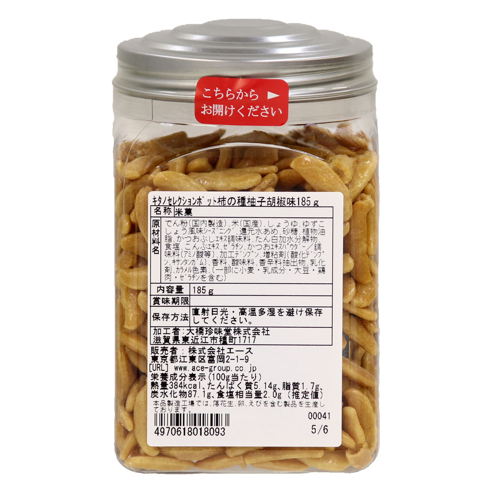 柚子の香りとだしを感じる、ほどよい辛さが特長です。一度食べるとクセになる味わいの柿の種です。