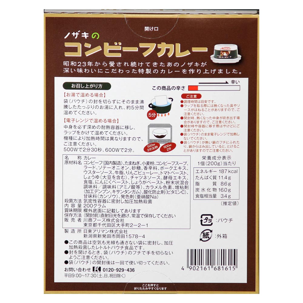 昭和23年から愛され続けてきたあのノザキが深い味わいにこだわった特製のレトルトカレーを作り上げました。