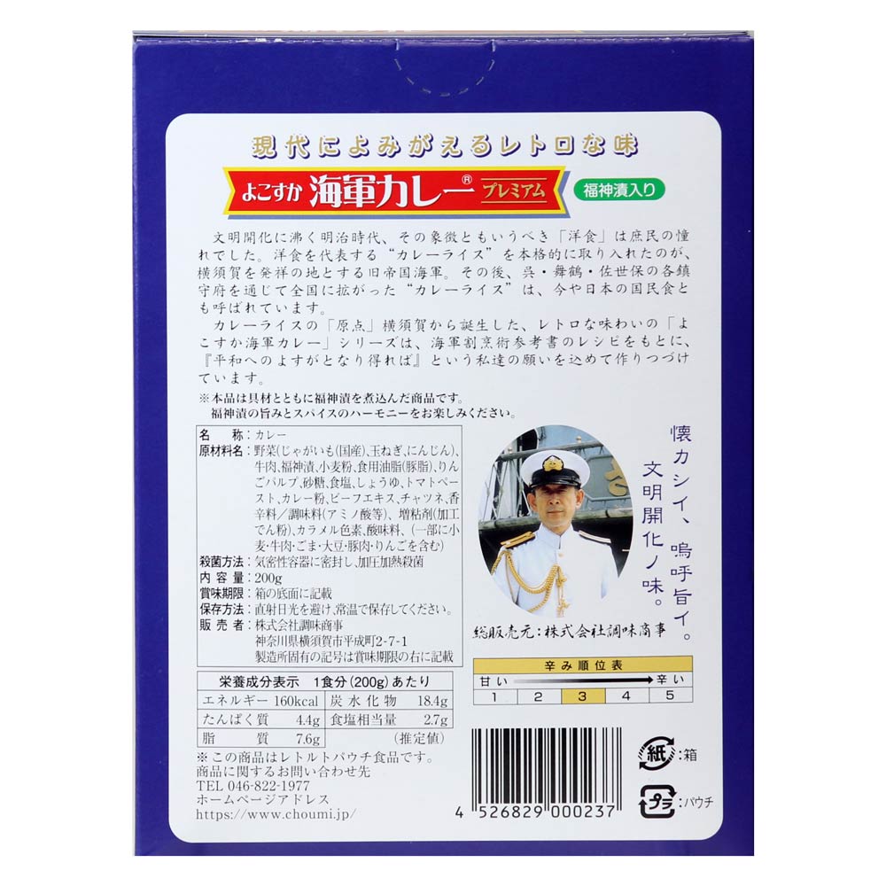 野菜(じゃがいも(国産)、玉ねぎ、にんじん)、牛肉、福神漬、小麦粉、食用油脂(豚脂)、りんごパルプ、砂糖、食塩、しょうゆ、トマトペースト、カレー粉、ビーフエキス、チャツネ、香辛料/調味料(アミノ酸等)、増粘剤(加工でん粉)、カラメル色素、酸味料、(一部に小麦・牛肉・ごま・大豆・豚肉・りんごを含む)