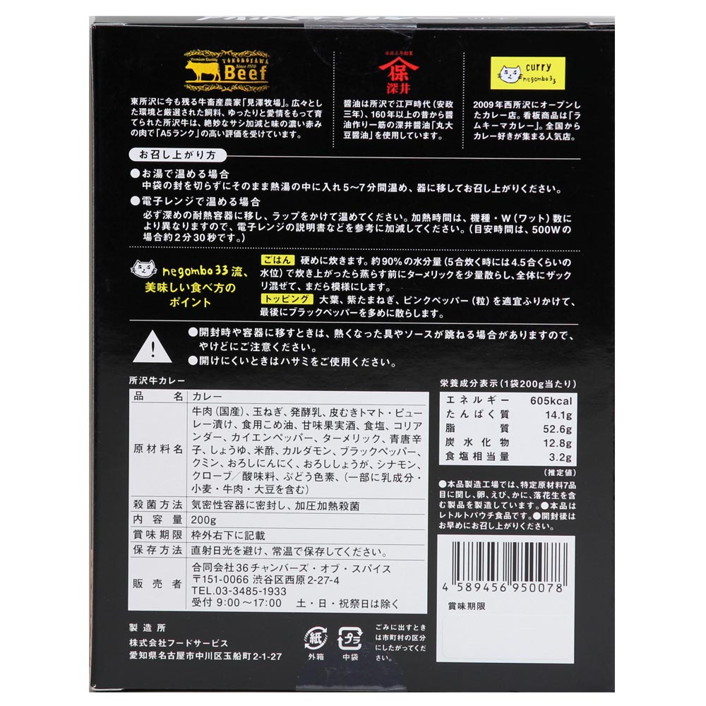 全国人気店「negombo33」が「所沢牛」(希少なブランド牛 見澤牛)で開発したレトルトカレー。 隠し味には、市内の老舗醤油屋「深井醤油」の丸大豆醤油を使用。
