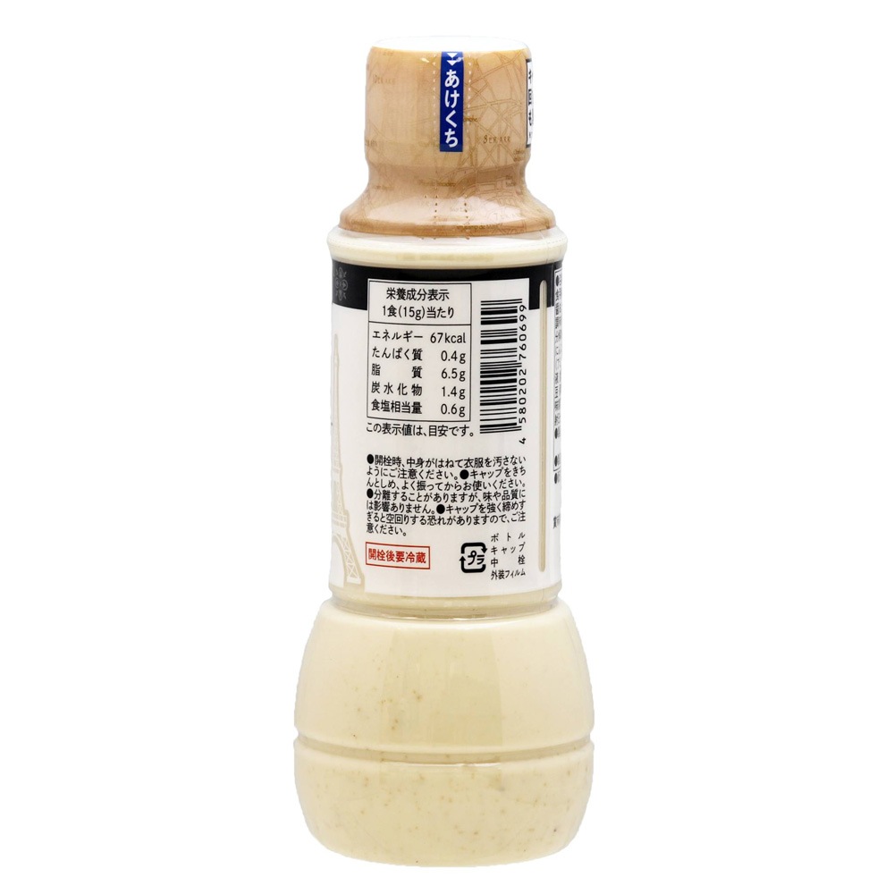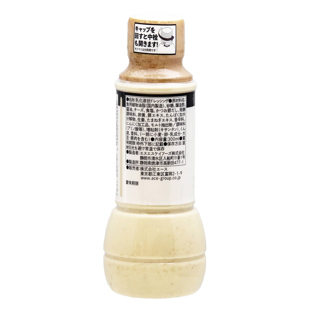 食用植物油脂(国内製造)、砂糖、醸造酢、醤油、チーズ、食塩、かつお節だし、発酵調味料、卵黄、豚エキス、たんぱく加水分解物、生姜、たまねぎエキス、香辛料、にんにく加工品、モルト抽出物/調味料(アミノ酸等)、増粘剤(キサンタン)、くん液、香料、(一部に小麦・卵・乳成分・大豆・豚肉を含む)