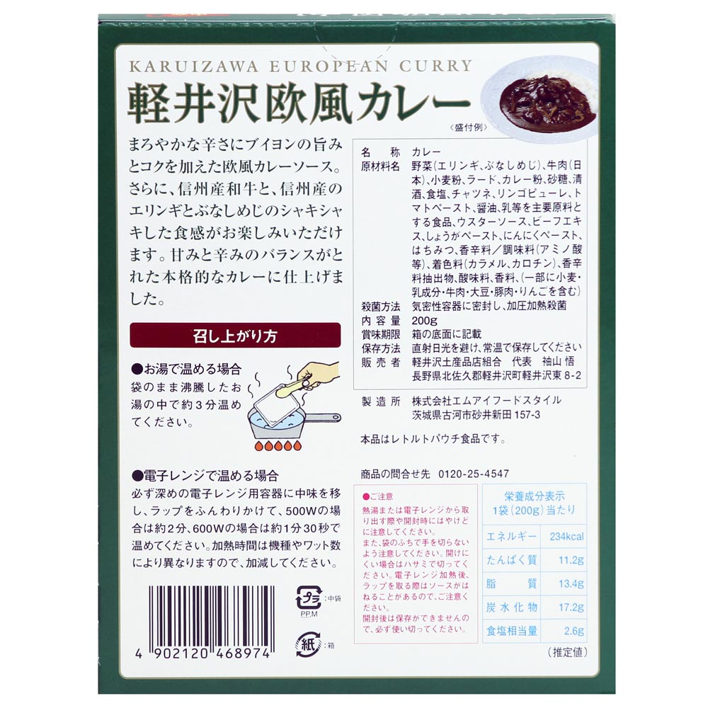 野菜(エリンギ、ぶなしめじ)、牛肉(日本)、小麦粉、ラード、カレー粉、砂糖、清酒、食塩、チャツネ、リンゴピューレ、トマトペースト、醤油、乳等を主要原料とする食品、ウスターソース、ビーフエキス、しょうがペースト、にんにくペースト、はちみつ、香辛料/調味料(アミノ酸等)、着色料(カラメル、カロチン)、香辛料抽出物、、酸味料、香料、(一部に小麦・乳成分・牛肉・大豆・豚肉・りんごを含む)