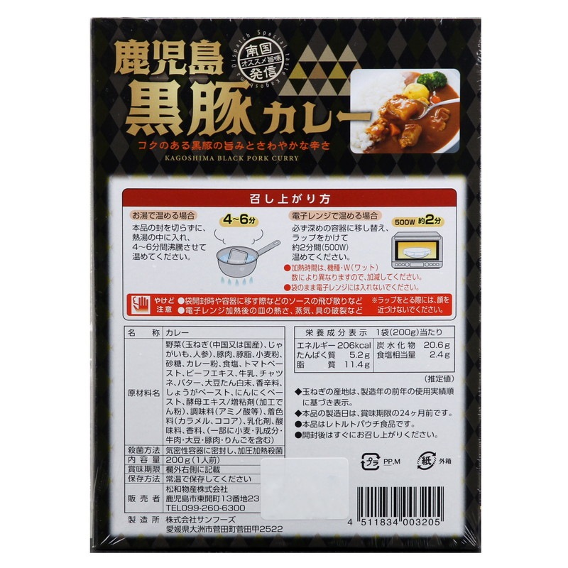 野菜(玉ねぎ(中国又は国産)、じゃがいも、人参)、豚肉、豚脂、小麦粉、砂糖、カレー粉、食塩、トマトペースト、ビーフエキス、牛乳、チャツネ、バター、大豆たん白末、香辛料、しょうがペースト、にんにくペースト、酵母エキス/増粘剤(加工でん粉)、調味料(アミノ酸等)、着色料(カラメル、ココア)、乳化剤、酸味料、香料、(一部に小麦・乳成分・牛肉・大豆・豚肉・りんごを含む)