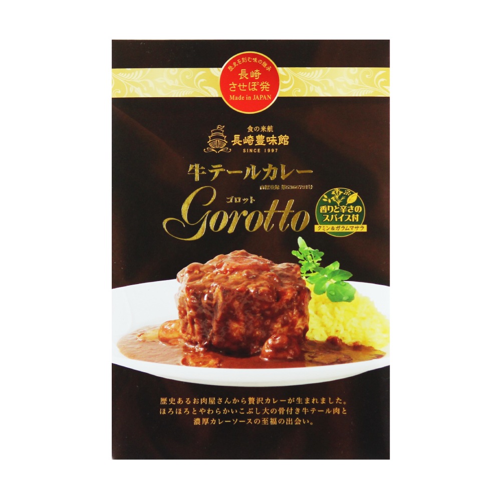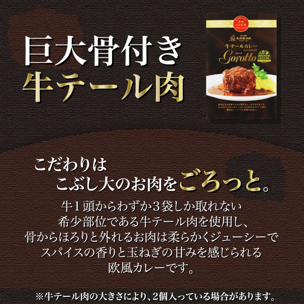 牛1頭からわずか3袋しか取れない希少部位である牛テール肉がこぶし大サイズでごろっと入っています。骨からほろりと外れるお肉は柔らかくジューシーでスパイスの香りと玉ねぎの甘味を感じられる欧風のレトルトカレーです。