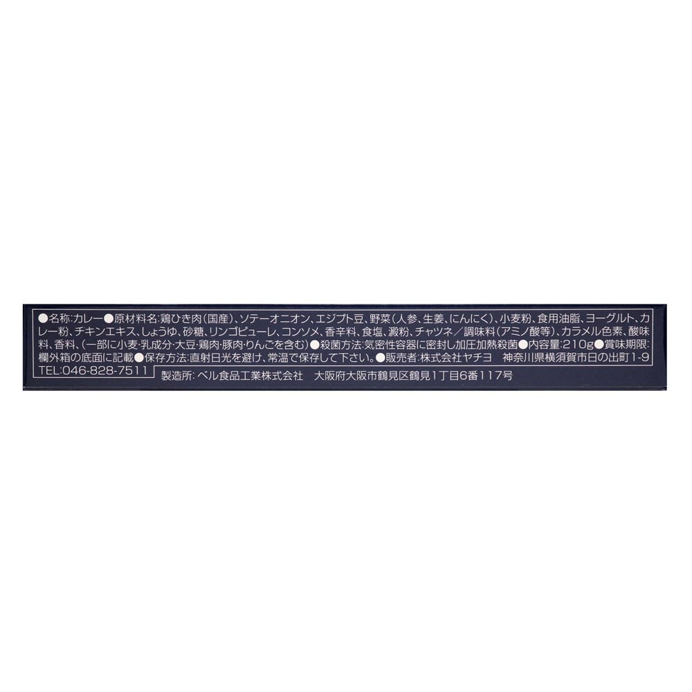 鶏ひき肉(国産)、ソテーオニオン、エジプト豆、野菜(人参、生姜、にんにく)、小麦粉、食用油脂、ヨーグルト、カレー粉、チキンエキス、しょうゆ、砂糖、リンゴピューレ、コンソメ、香辛料、食塩、澱粉、チャツネ/調味料(アミノ酸等)、カラメル色素、酸味料、香料、(一部に小麦・乳成分・大豆・鶏肉・豚肉・りんごを含む)
