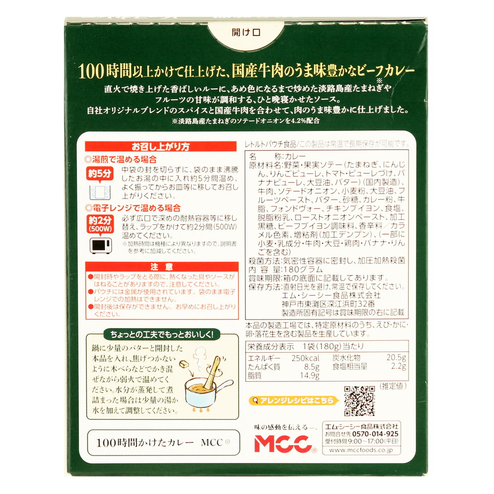 野菜・果実ソテー(たまねぎ、にんじん、りんごピューレ、トマト・ピューレづけ、バナナピューレ、大豆油、バター)(国内製造)、牛肉、ソテードオニオン、小麦粉、大豆油、フルーツペースト、バター、砂糖、カレー粉、牛脂、フォンドヴォー、チキンブイヨン、食塩、脱脂粉乳、ローストオニオンペースト、加工黒糖、ビーフブイヨン調味料、香辛料/カラメル色素、増粘剤(加工デンプン)、(一部に小麦・乳成分・牛肉・大豆・鶏肉・バナナ・りんごを含む)